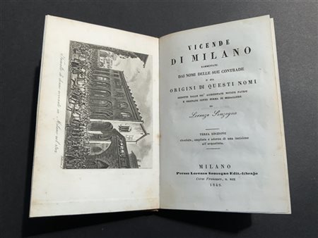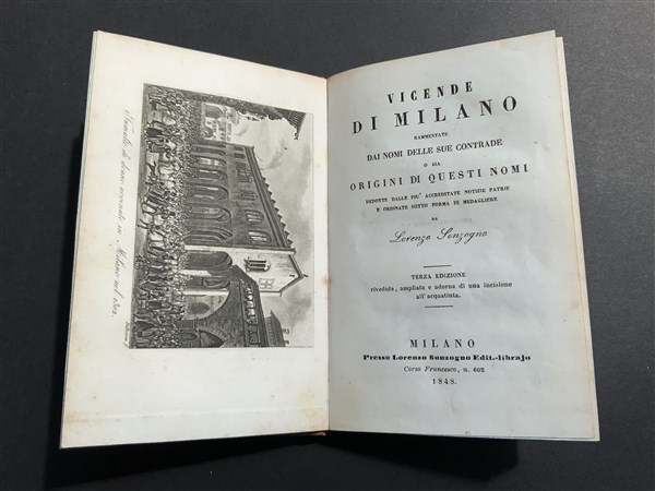 SONZOGNO, Lorenzo. Vicende di Milano rammentate dai nomi delle sue contrade o sia origini di questi nomi / dedotte dalle più accreditate notizie patrie. Terza edizione, ampliata e adorna di una incisione all'acquatinta. Milano: Presso Lorenzo Sonzogno, 1848. 8vo. Nel libro vi è aggiunta in fine una pianta della città di Milano (208 x 237mm) (alcune fioriture e bruniture). Percallina coeva decorata a secco con etichetta in carta al dorso, preservata in cofanetto moderno in carta decorata. Collazionato e completo