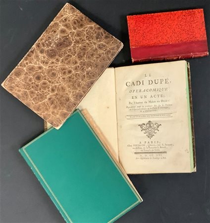 [TEATRO - COMMEDIA FRANCESE] Lotto di 4 volumi della commedia dell'arte francese: 1] COSTANTINI Angelo, La vie de Scaramouche. Parigi: Barbin, 1696. 12mo, Ritratto in antiporta. Legatura ottocentesca in mezzo marocchino rosso con piatti marmorizzati. 2] LEMONNIER Pierre-René, Le cadi dupé, opéra-comique en un acte. Parigi: Duchesne, 1761. 8vo, partitura musical ein fine volume. Legatura coeva in cartonato marmorizzato 3] PHILIDOR. Le Bûcheron, ou les trois souhaits. Parigi: Herissant, 1763. 8vo, partitura musicale in fine. Legatura coeva in cartonato marmorizzato. 4] GOLDONI Le Bourru bienfaisant. Parigi: Duchesne, 1771. 8vo, legatura moderna in marocchino verde