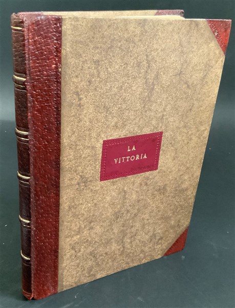 TORELLI, Pomponio. La Vittoria, tragedia. Parma: Erasmo Viotti, 1605. 4to, grande impresa dell'Accademia degli Innominati di Parma incisa in legno al frontespizio, testatina e capilettera xilografici (leggermente rifilato nel margine superiore e un po' brunito). Legatura moderna in mezza pelle con punte e piatti marmorizzati, applicato al piatto anteriore tassello in pelle con titoli oro. Non collazionato e difetti da esaminare.