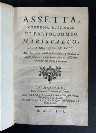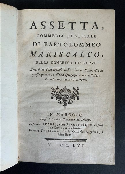 [TRINCI Mariano] MARISCALCO Bartolomeo. Assetta, commedia rusticale. Parigi: Prault, Tilliard, 1756. 8vo, fregio al frontespizio e ornamenti tipografici (lievi bruniture e fioriture). Legatura coeva in piena pelle con ex libris dorato "Caissotti" conte di Chiusano, al piatto anteriore (lievi difetti). Prima edizione di questa farsa rusticale dui Trinci, detto "Maniscalco" per la sua professione, uno dei primi autori della Congrega dei Rozzi di Siena.