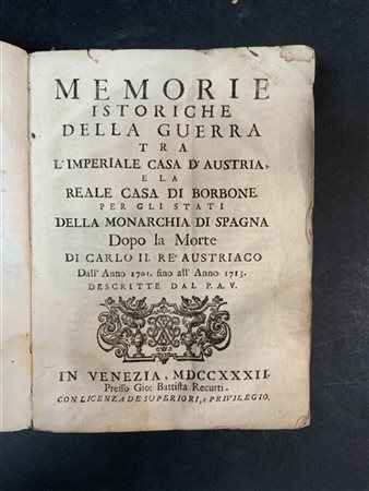 [UMICALA, Agostino] Memorie istoriche della guerra tra l'imperiale casa d'Austria e la reale casa di Borbone. Venezia: Recurti, 1732. 4to, legatura coeva in piena pergamena (parzialmente staccata) Prima edizione di questo ricco saggio sulla guerra dei 30 anni. Non collazionato e difetti da esaminare.