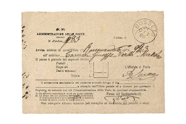 VERDI, Giuseppe (1813-1901) - Firma autografa su raccomandata. Busseto: 31 Ottobre 1889. (110 x 155mm). Ricevuta di raccomandata.