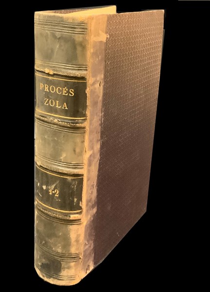 ZOLA, Émile. L'Affaire Dreyfus. Le Procès Zola devant la Cour d'Assises de la Seine et la Cour de Cassation (7 février-23 février - 31 mars-2 avril 1898). Compte-rendu sténographique "in-extenso" et documents annexes. Parigi: aux bureaux du Siècle, P.-V. Stock, 1898. 8vo (225 x 133mm). 2 parti in un volume. Con una serie di documenti in facsimile legati in fine. Dorso in pelle coeva, titolo in oro (difetti). Non collazionato e difetti da esaminare.