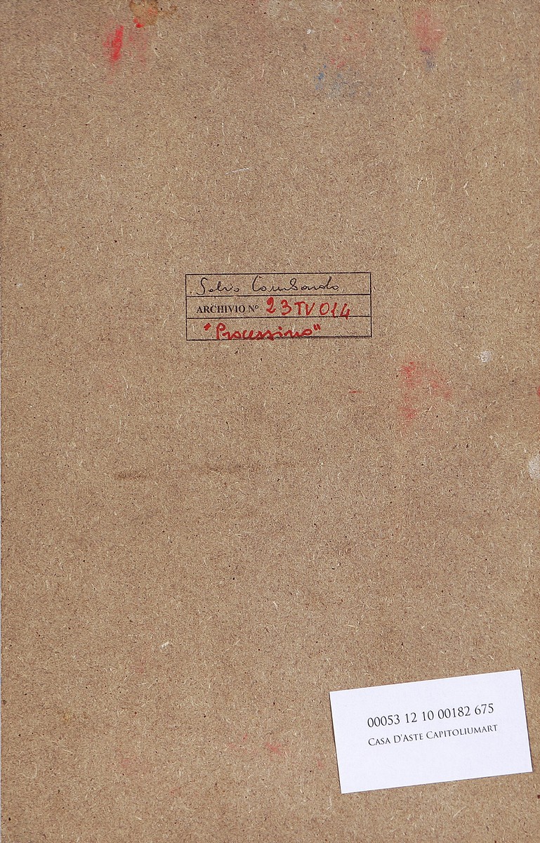 LOMBARDO SALVO (n. 1948) Processino. Tecnica mista su tavola. Cm 30x20. Autentica dell'artista su fotografia. Firma in basso a sinistra. Al retro timbro con firma, titolo e numero d'archivio.