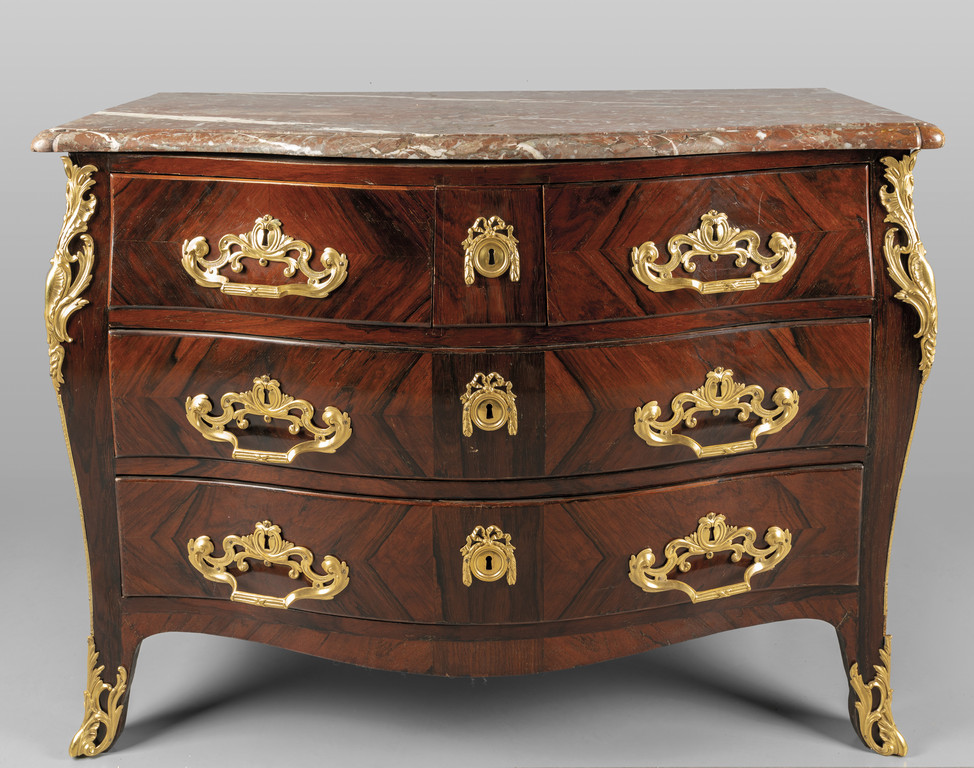 Comò Luigi XIV lastronato in palissandro ricca decorazione in bronzo dorato stampigliato STUMP piano in marmo Francia sec.XVIII