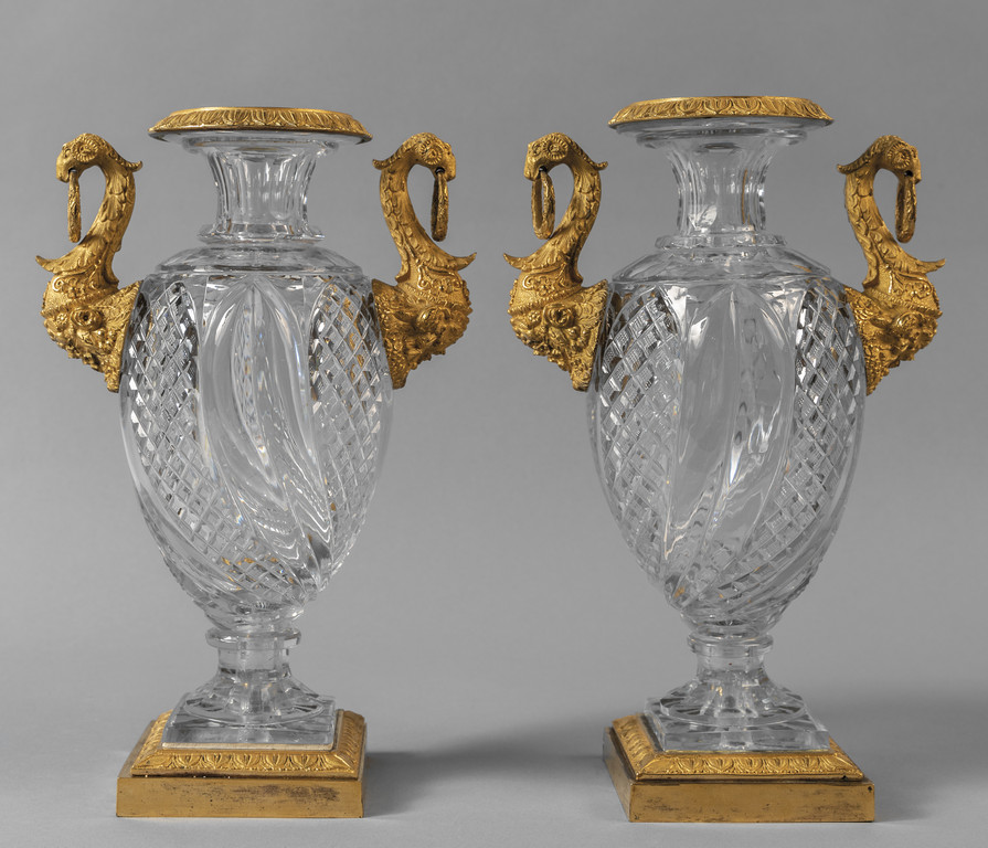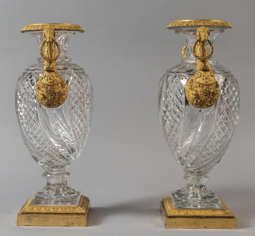 Coppia di vasi in cristallo molato con ricca decorazione in bronzo dorato prese a forma di caproni Francia inizi sec.XIX