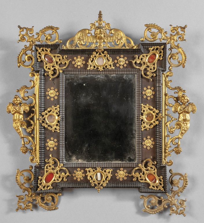 Piccola specchiera in ebano con intarsi in pietre dure e ricca decorazione in bronzo dorato Spagna sec.XIX