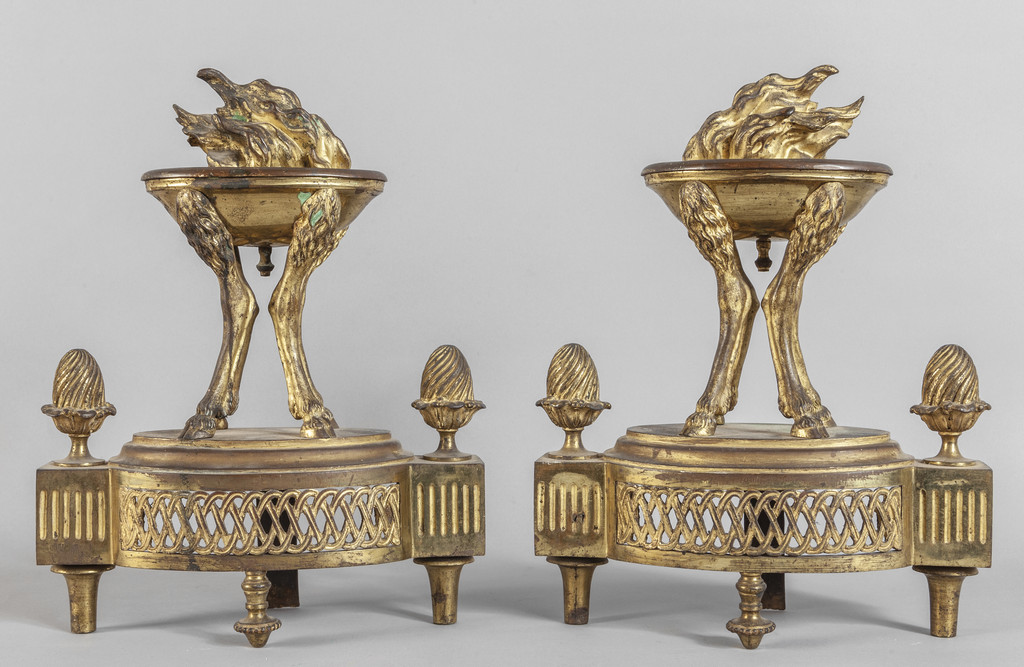 Coppia di alari Luigi XVI in bronzo dorato Francia sec.XVIII