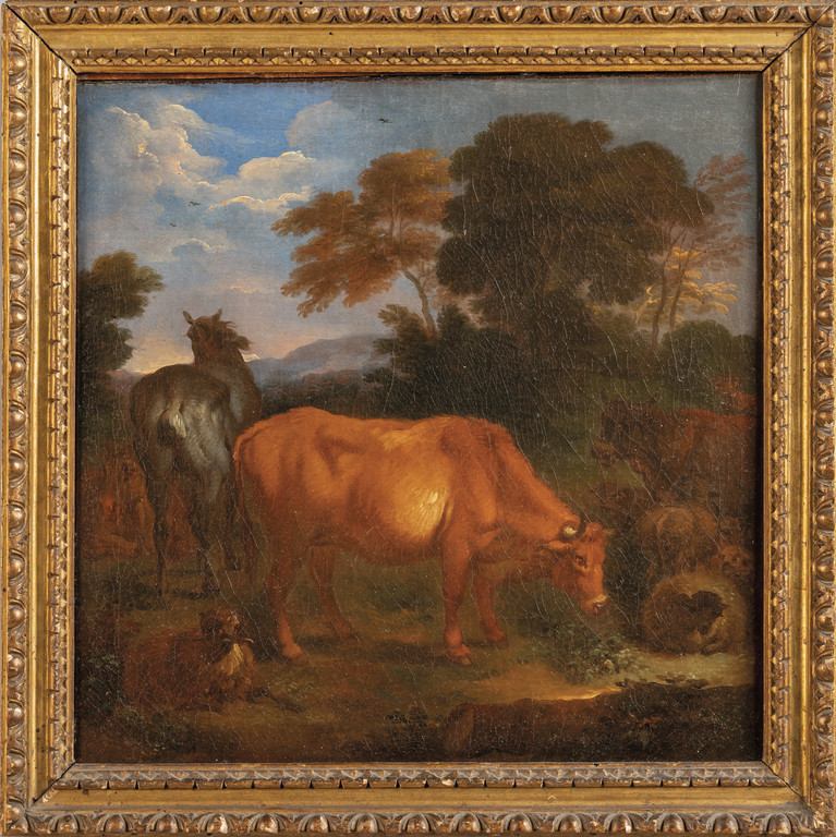 'Paesaggio con animali' olio cornice antica in legno intagliato e dorato