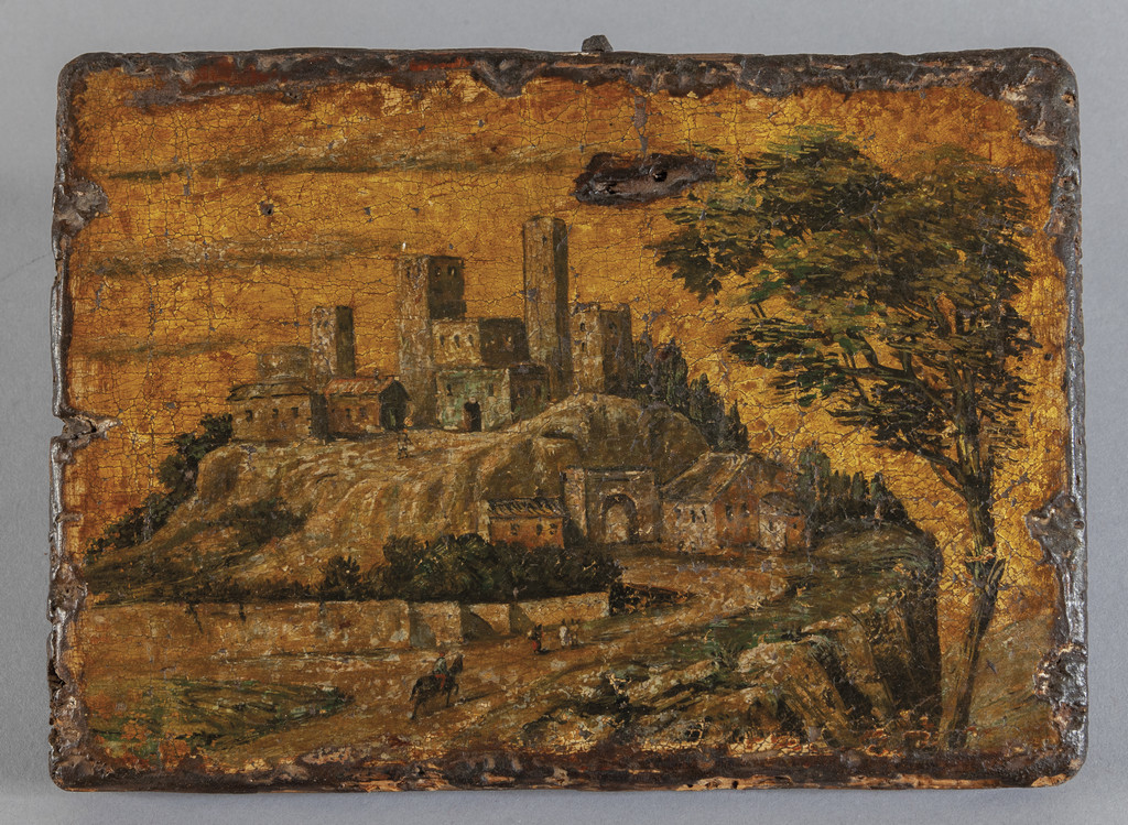 'Paesaggio turrito con viandanti' dipinto a fondo oro sec.XVIII