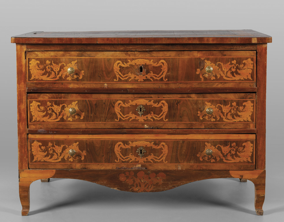 Comò Luigi XIV a tre cassetti lastronato in noce e legni vari piano in legno Roma sec.XVIII
