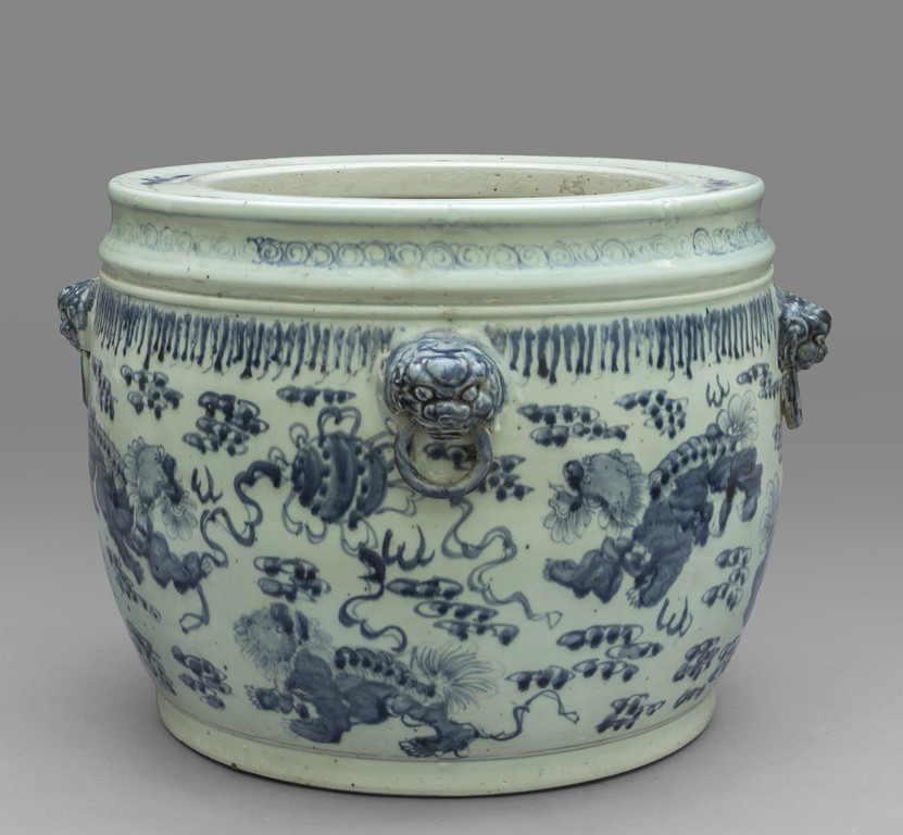 Grande cachepot in porcellana bianca e blu decorato con animali fantastici Cina fine sec.XIX