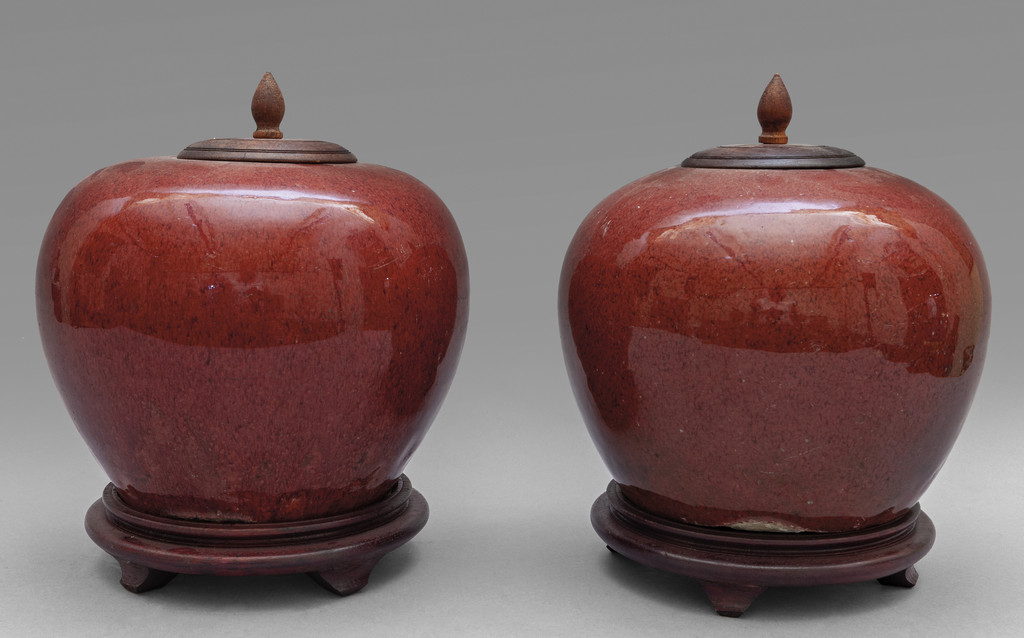 Coppia di vasi sangue di bue basi e coperchi in legno