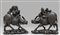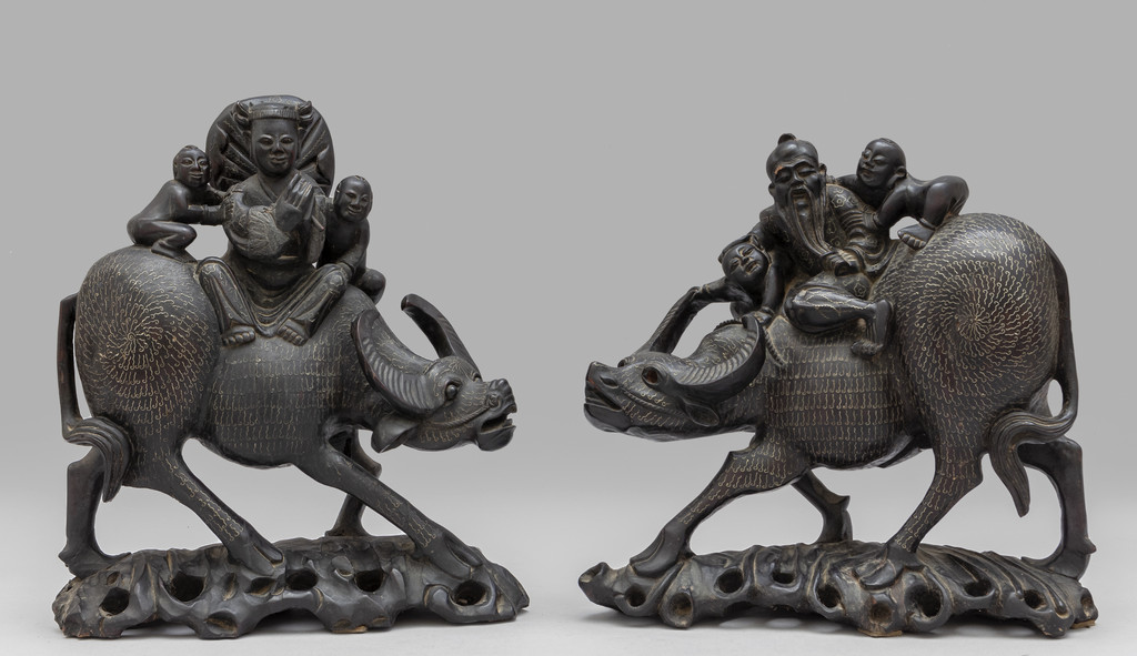 Bisonti con figure coppia di sculture in legno duro con ricca applicazione in metallo Cina inizi sec.XIX