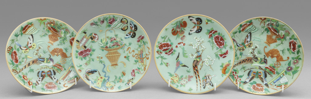 Quattro piattini in porcellana Celadon decorati con uccelli fiori e farfalle