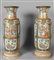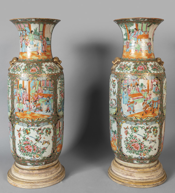 Coppia di grandi vasi in porcellana canton decorati in policromia e oro con scene di vita cinese sec.XIX poggianti su basi in legno
