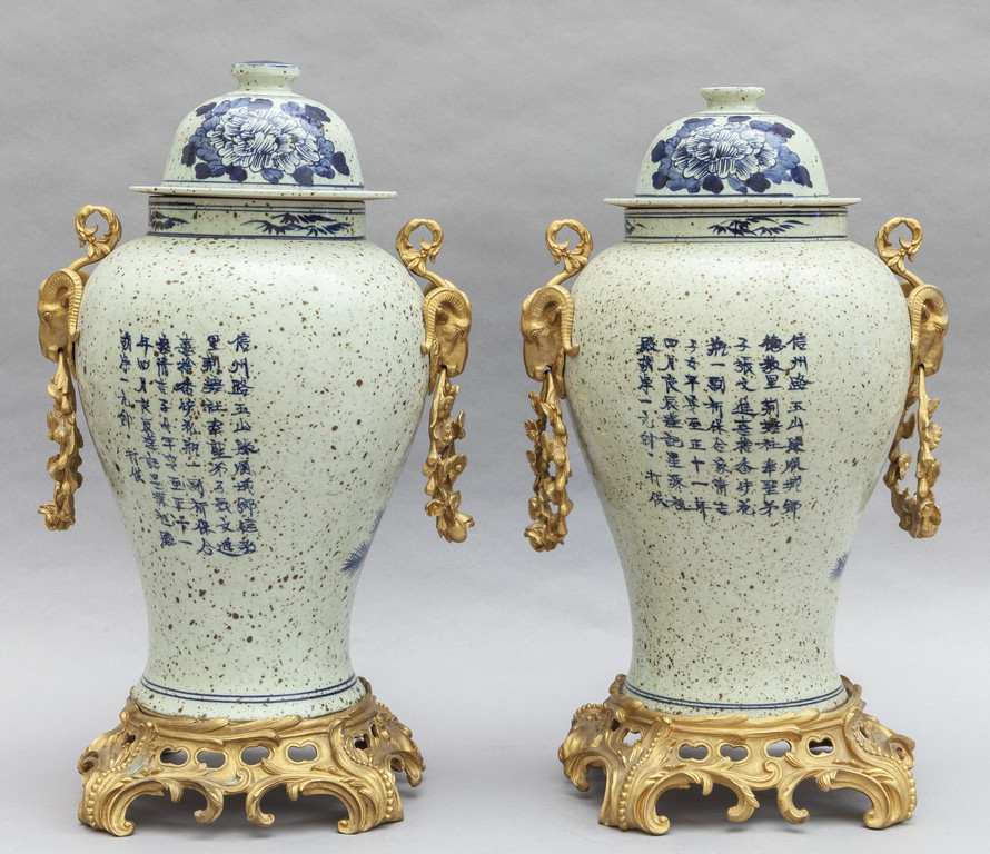 Coppia di potiches in porcellana bianca e blu con fiori ricca decorazione in bronzo dorato Cina sec.XIX