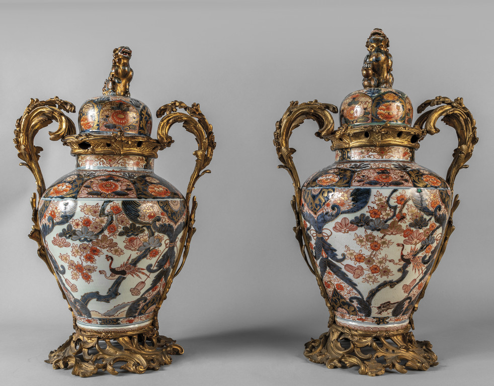 Coppia di potiches Imari in porcellana policroma con ricca decorazione in bronzo dorato sec.XVII