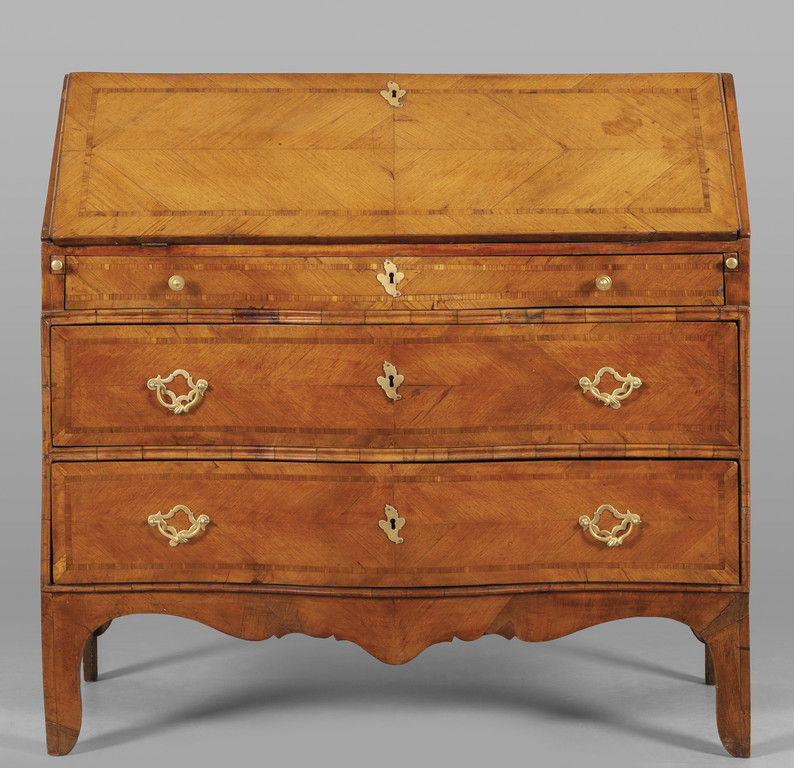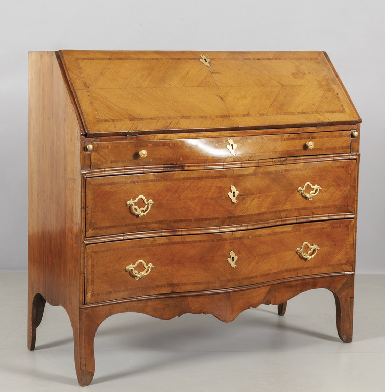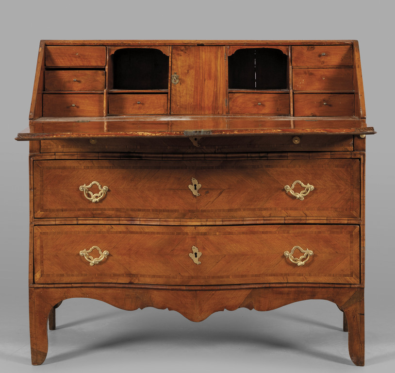 Ribalta Luigi XIV movimentata sul fronte due cassetti più uno e calatoia che cela una serie di cassettini lastronata sul fronte in palissandro e filettata in bois de rose Genova I metà sec.XVIII