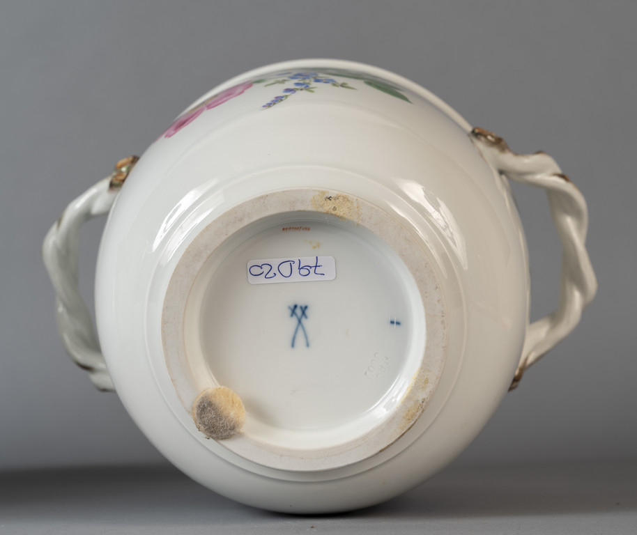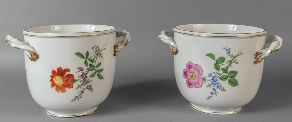 Coppia di cachepot in porcellana di Meissen decorati a fiori su fondo bianco prese a forma di nastri intrecciati