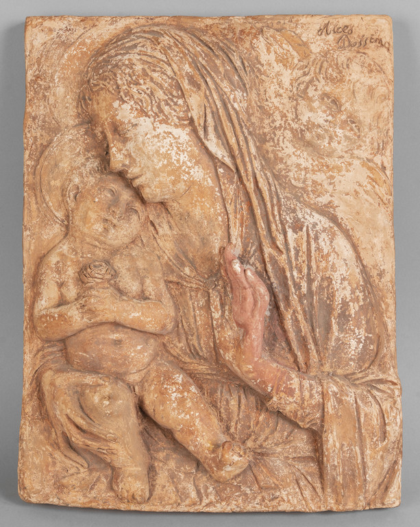 Alceo Dossena (1878-1937) Madonna con Bambino placca in terracotta f.ta in a. a ds.