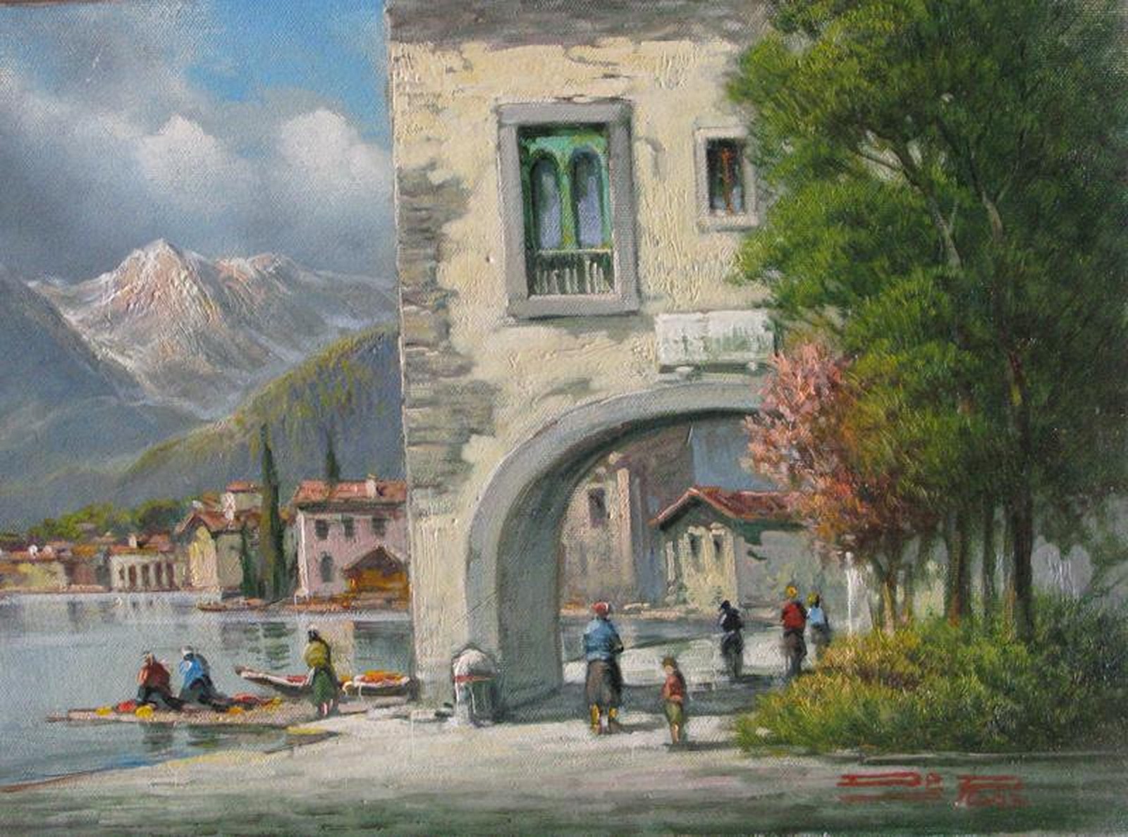 DE ROSA Paesaggio lacustre. Olio su tela. Cm 30x40. Firma in basso a destra.