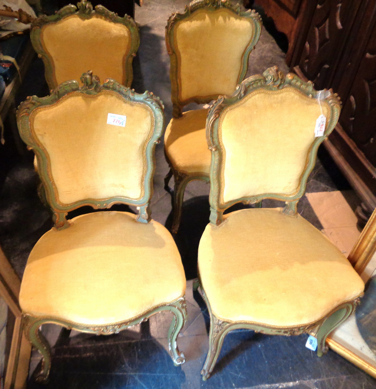 Quattro sedie in stile Luigi XV in legno intagliato dorato e laccato a fondo verde