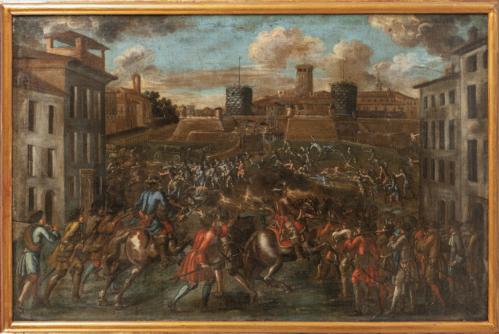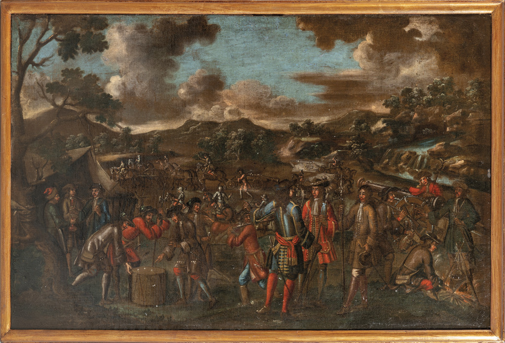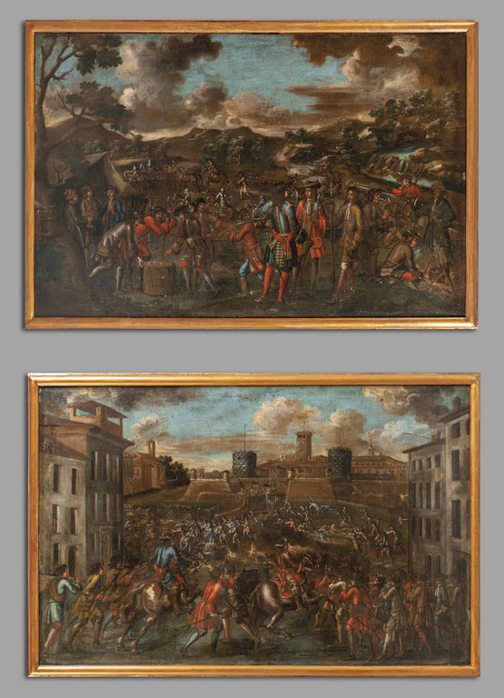 Scuola francese sec.XVII 'Battaglie' coppia di olii