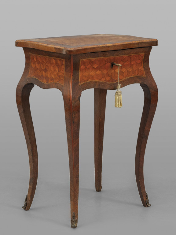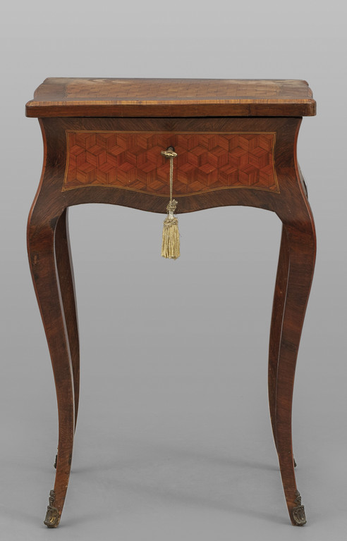 Tavolino da lavoro da centro in stile Luigi XV movimentato sul fronte e sui fianchi lastronato in palissandro e finemente intarsiato a marquetterie Francia sec.XIX