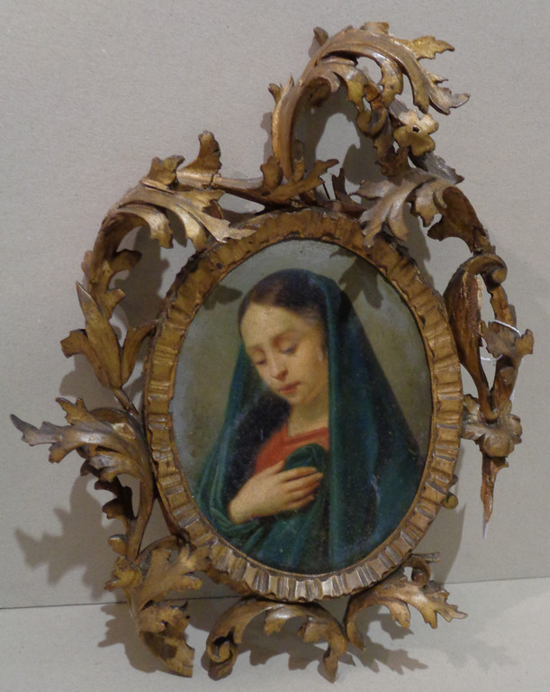 'Madonnina' olio su cartoncino di forma ovale cornicetta in legno finemente intagliato e dorato (difetti e mancanze) sec.XIX