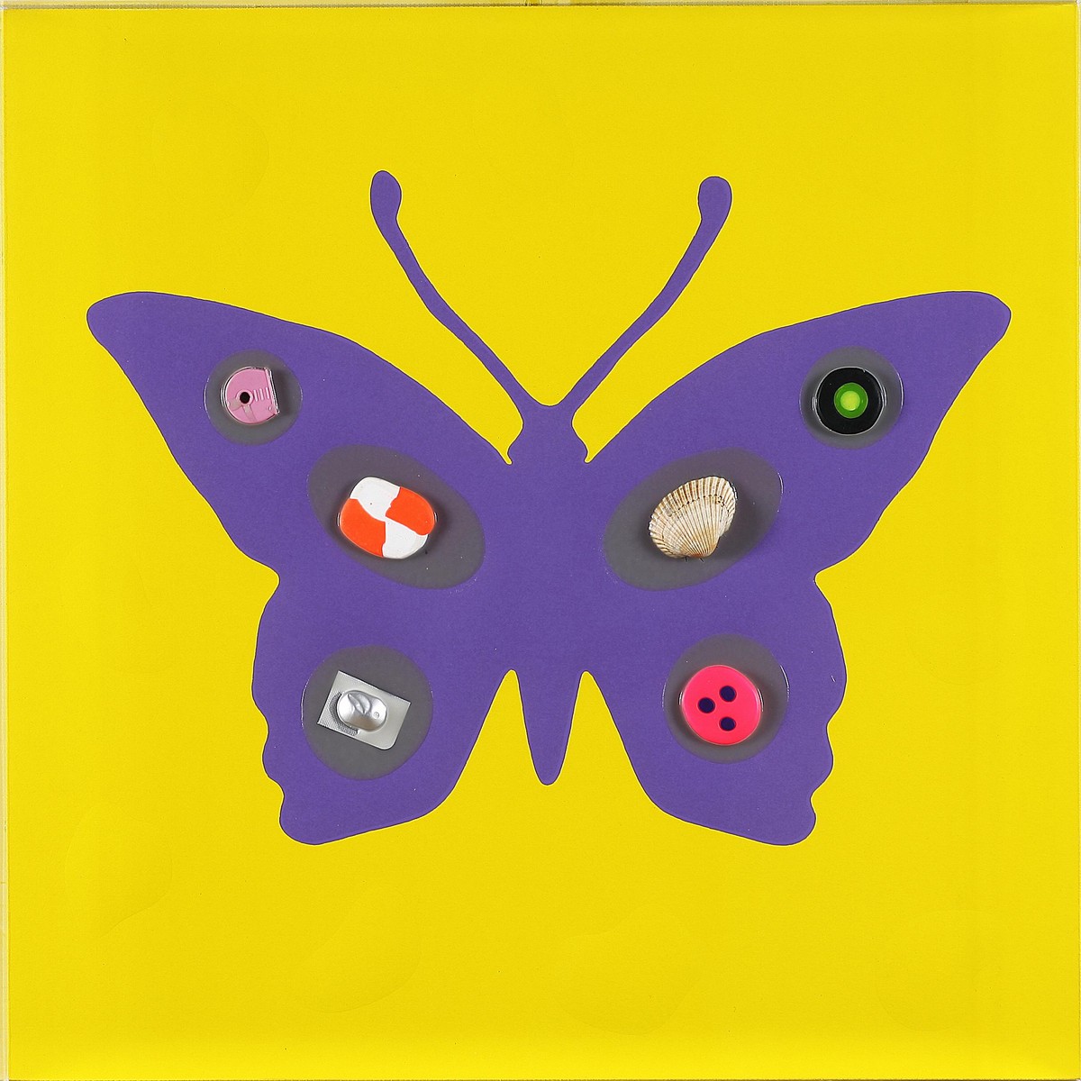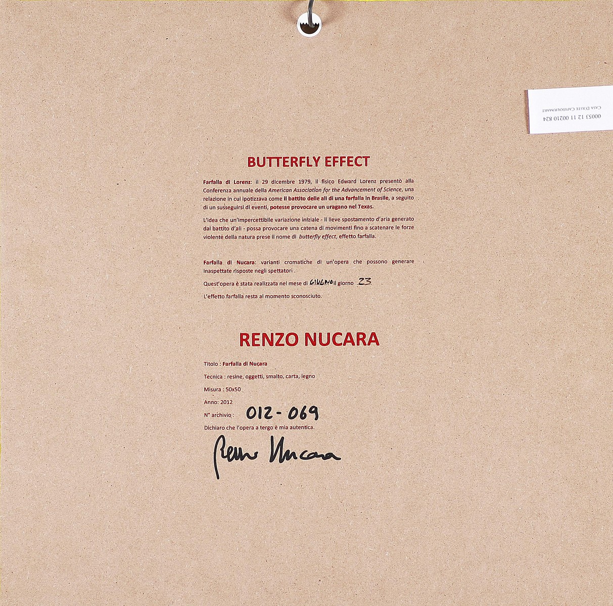 NUCARA RENZO (n. 1955) Butterfly effect (farfalla di Nucara), 2012. Resine, oggetti, smalto, carta, legno. Cm 50x50. Autentica dell'artista su fotografia. Al retro titolo, data, tecnica e firma per autentica.