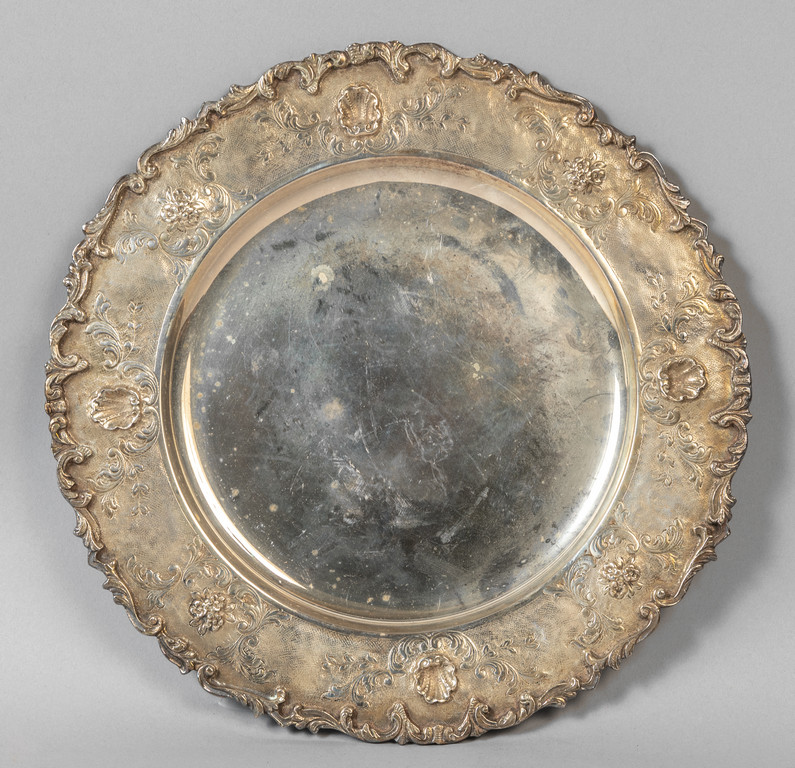Piatto in argento bordo sbalzato decorato con conchiglie