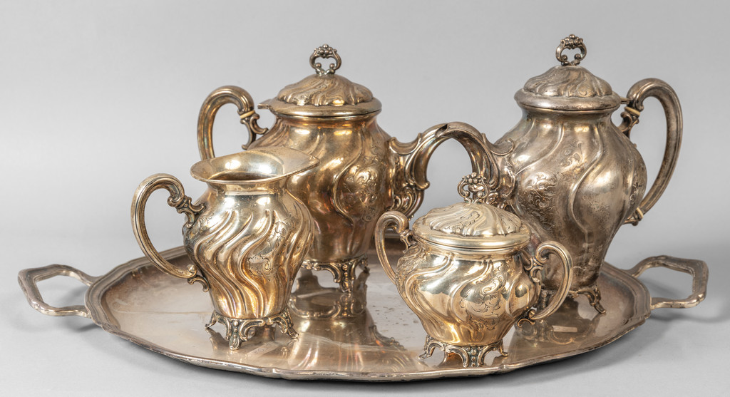 Servizio da the in argento sbalzato composto da quattro pezzi più vassoio con manici