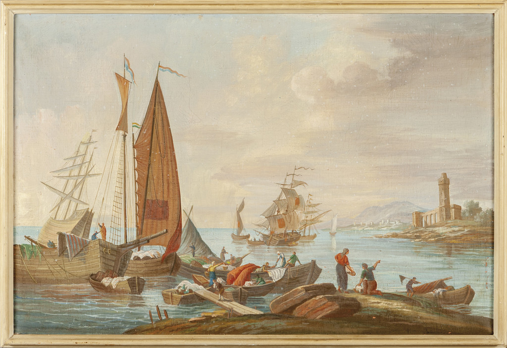 Scuola francese sec.XX 'Marina con personaggi' olio