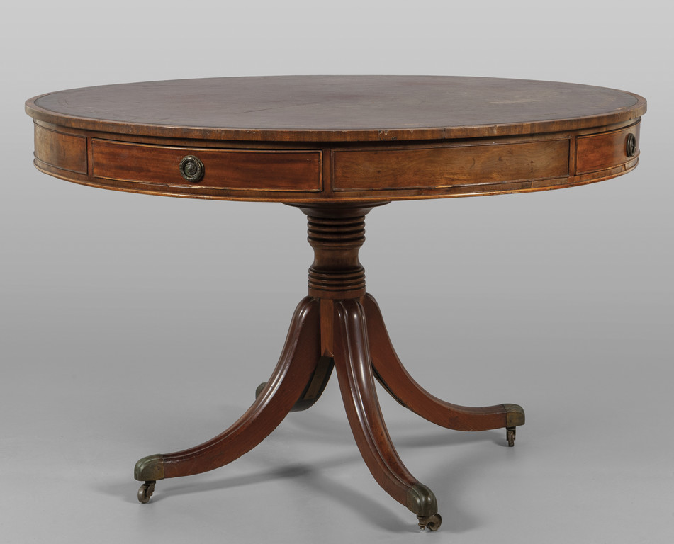 Tavolo da libreria rotondo in mogano con piano in pelle quattro cassetti nella fascia Inghilterra sec.XIX