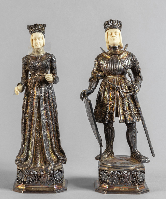 Il Re e la Regina coppia di statuette in argento 925 finemente sbalzato con testine in avorio Germania sec.XIX