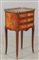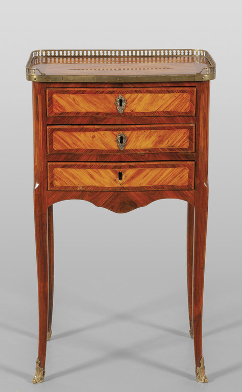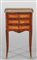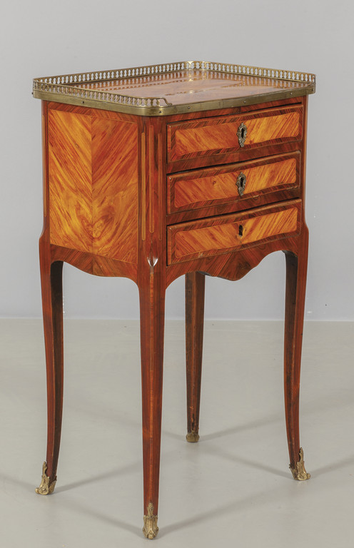 Comodino a tre cassetti lastronato in palissandro e legni di rosa parte superiore con ringhierina Francia sec.XVIII