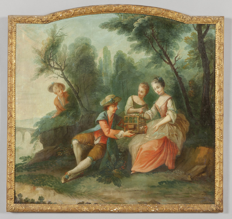 Scuola piemontese sec.XVIII 'Scena galante' olio cornice coeva in legno intagliato e dorato