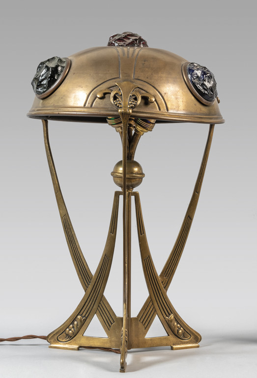 Lampada Liberty in metallo dorato con cabochon in vetri colorati grezzi inizi sec. XIX