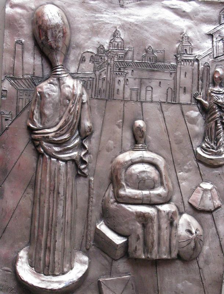 DE CHIRICO GIORGIO (1888 - 1978) Senza titolo. Scultura. Cm 38,8x26x4. Bassorilievo in resina e matallo argentato. D'apres.