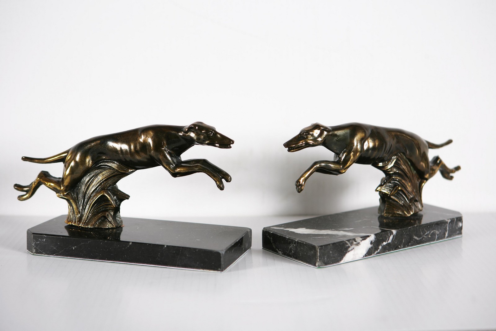 ANONIMO Coppia di fermalibri con levrieri. Marmo e ottone. Cm 13,5x19x9. Base in marmo.