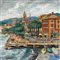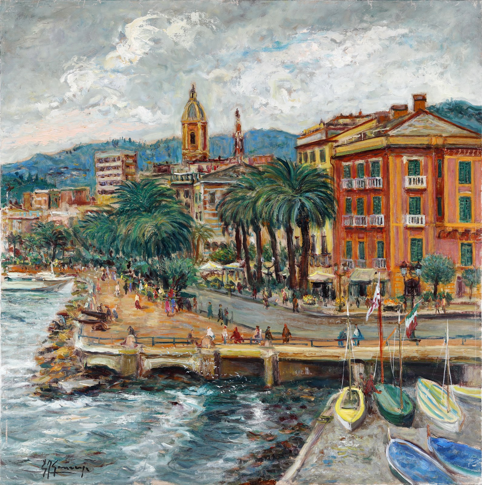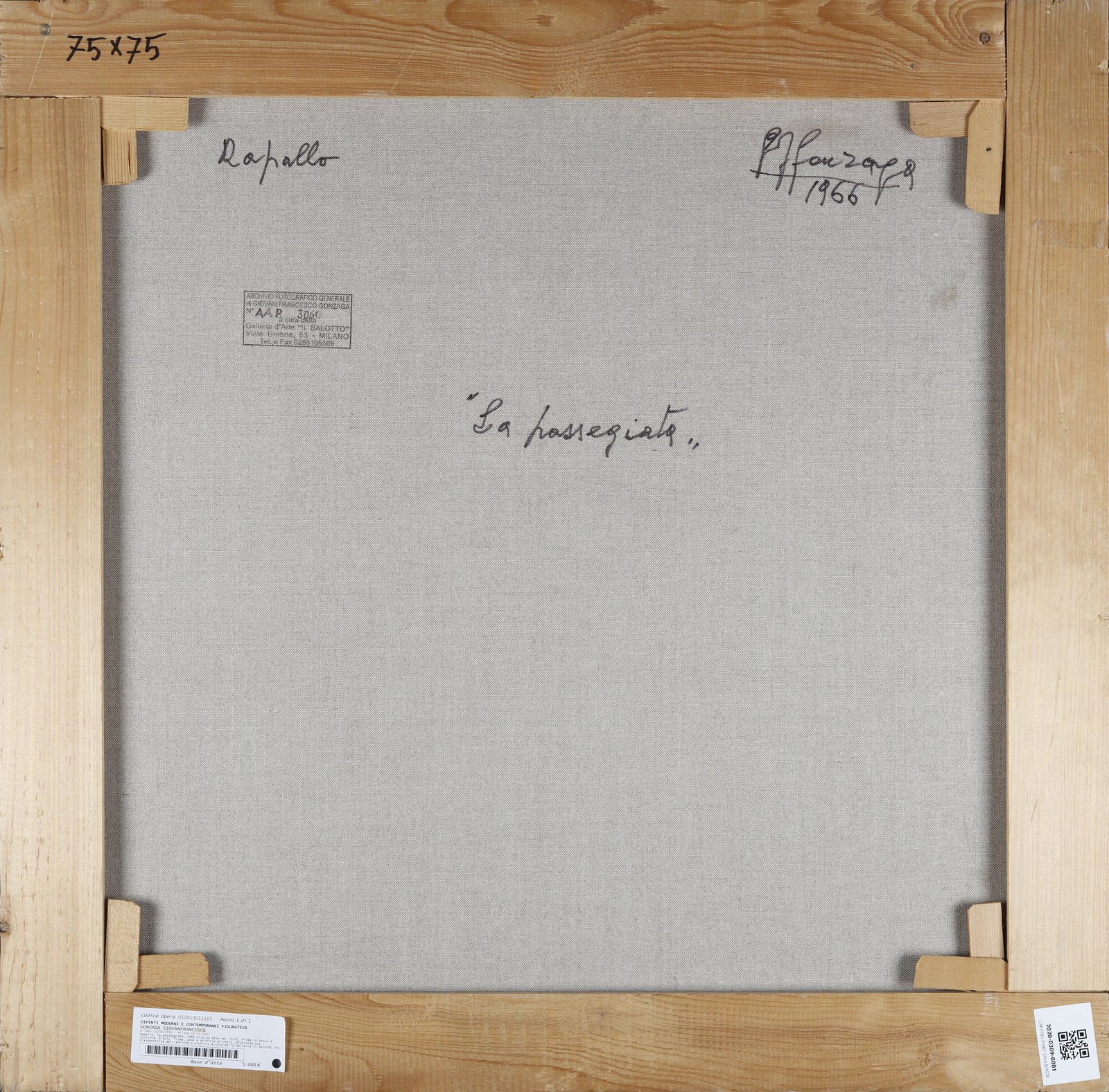 GONZAGA GIOVAN FRANCESCO (1921 - 2007). La passeggiata ''Rapallo''.. Firma in basso a sinistra. Al retro tiolo, firma e anno. Opera archiviata presso l'Archivio Fotografico Generale di Giovan Francesco Gonzaga come da documentazione fotografica allegata all'opera. Bibliografia: -""Giovan Francesco Gonzaga, Catalogo Generale delle Opere"", Volume 1, Editoriale Giorgio Mondadori, piena pagina 91.. Cm 75,00 x 75,00.