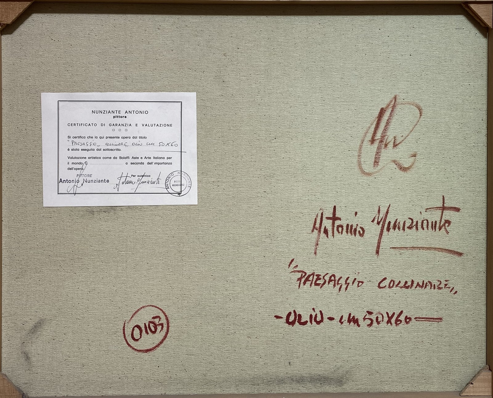 NUNZIANTE ANTONIO (n. 1956). Paesaggio collinare.. Firma, titolo e cartiglio descrittivo dell'artista al retro.. Cm 60,00 x 50,00.