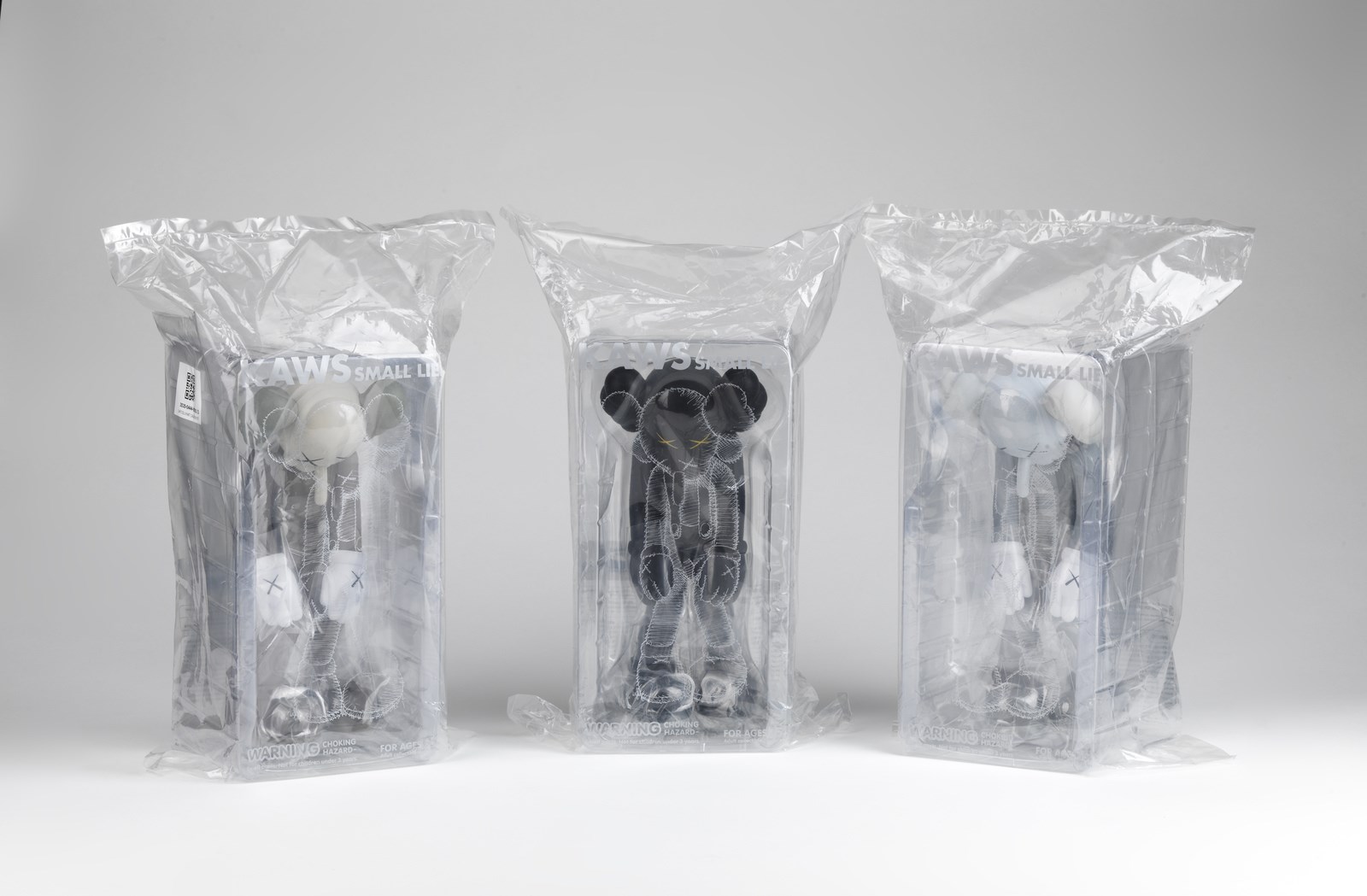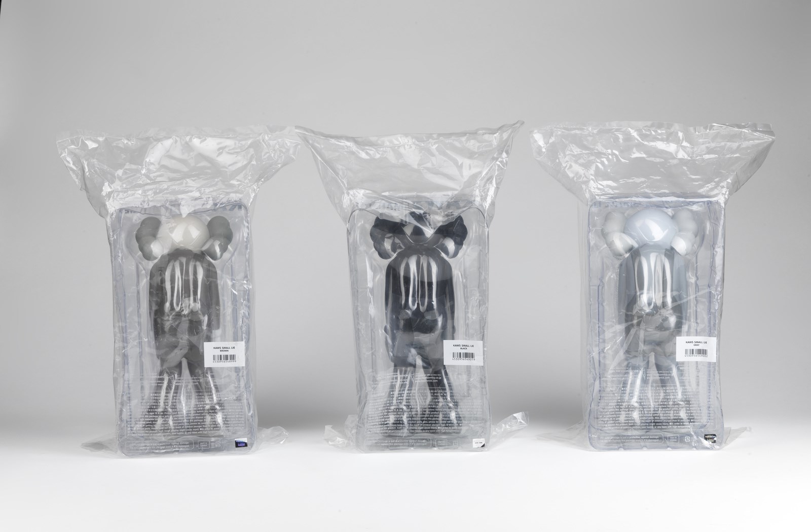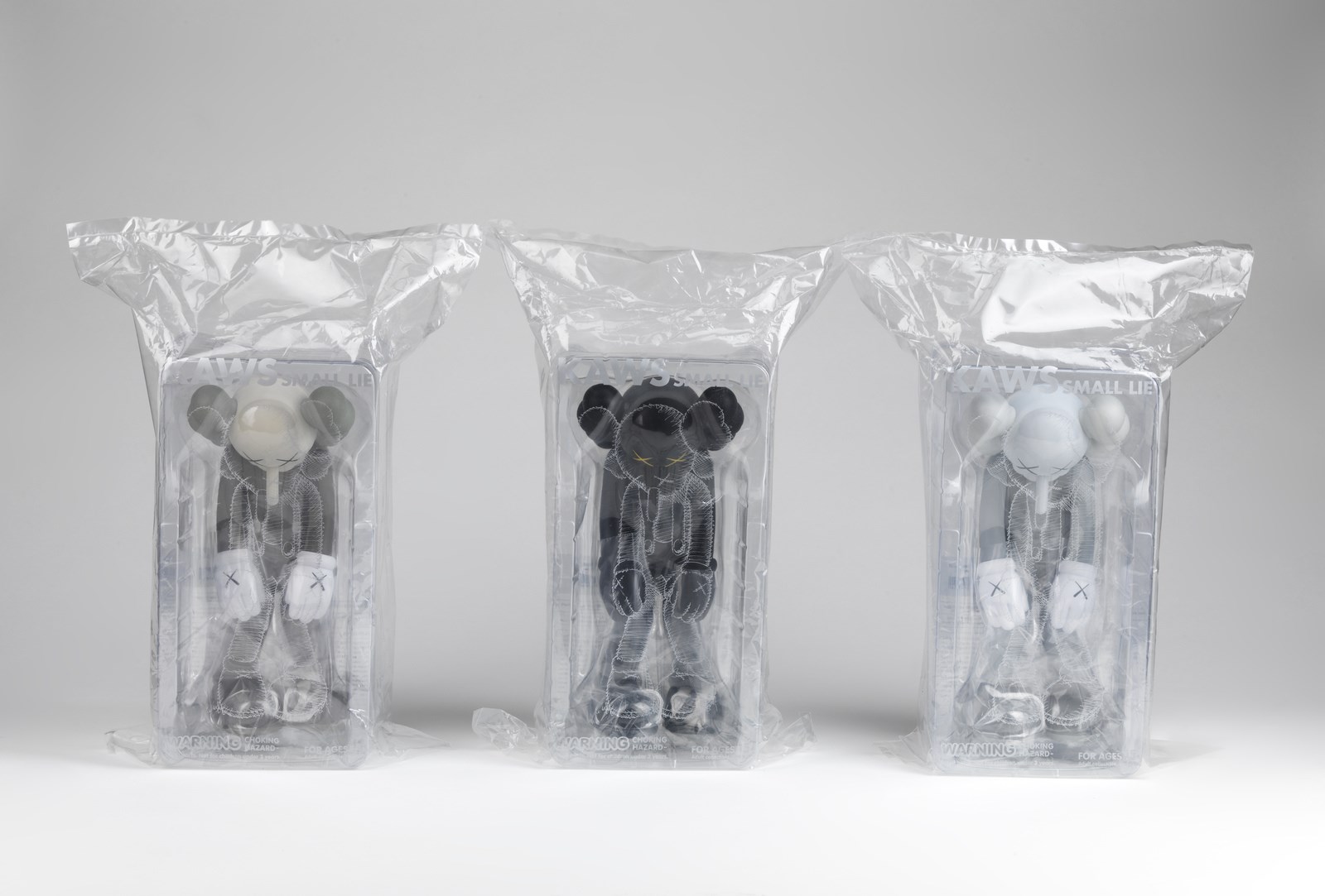 KAWS (n. 1974). Tre Sculture: (i) Small Lie (Brown); (ii) Small Lie (Black); (iii) Small Lie (Grey). Tre multipli in vinile dipinto, 2017, nome dell'artista, data, fabbricatore e titolo stampati alla base: 'KAWS..17 SMALL LIE MEDICOM TOY CHINA'' , contenuti nella confezione originale Medicom Toy, da un'edizione limitata edita da Medicom Toy, Giappone.. Cm 12,00 x 27,50 x 12,00. 2017