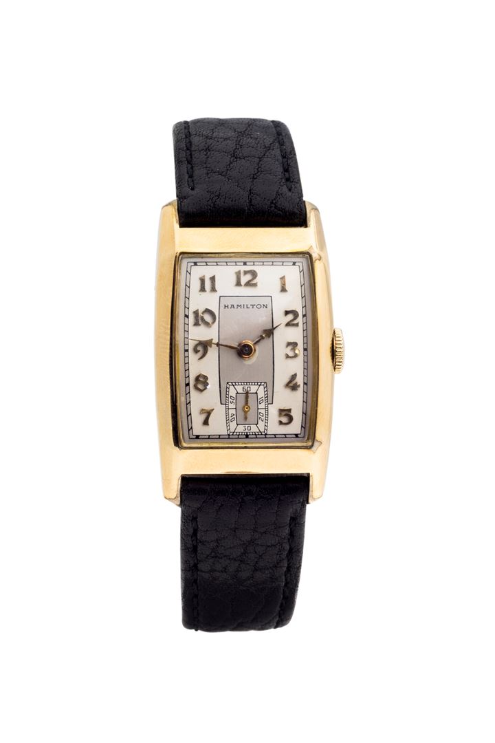 Cassa curva placcata; quadrante bitonale con numeri arabi applicati, indicazione secondi continui al 6