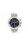 Cassa in acciaio, con fondello personalizzato per le “Frecce Tricolori”. Quadrante blu con indicazione delle 24 ore al 12, data al 3, delle 12 ore al 6 e secondi continui al 9. Doppia cronografia centrale “split seconds”. Tasto di azzeramento cronografia rotto