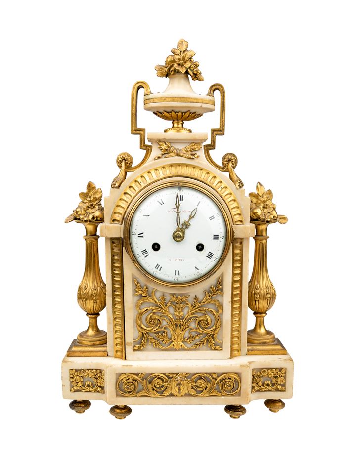 Francia, epoca Luigi XVI, fine XVIII secolo, in marmo bianco e bronzi cesellati e dorati al mercurio, quadrante in smalto bianco con ore in cifre romane, firmato "Festeau à Paris"