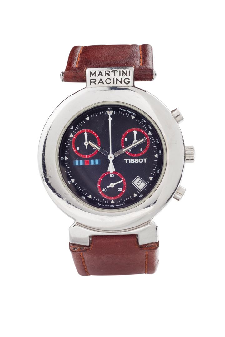 Cassa in due corpi, in acciaio, quadrante antracite, indici geometrici serigrafati; scala tachimetrica periferica; contatore decimi di secondo al 2, piccoli secondi al 6, ore al 10. Minuti e secondi centrali. Personalizzato per "Martini Racing"