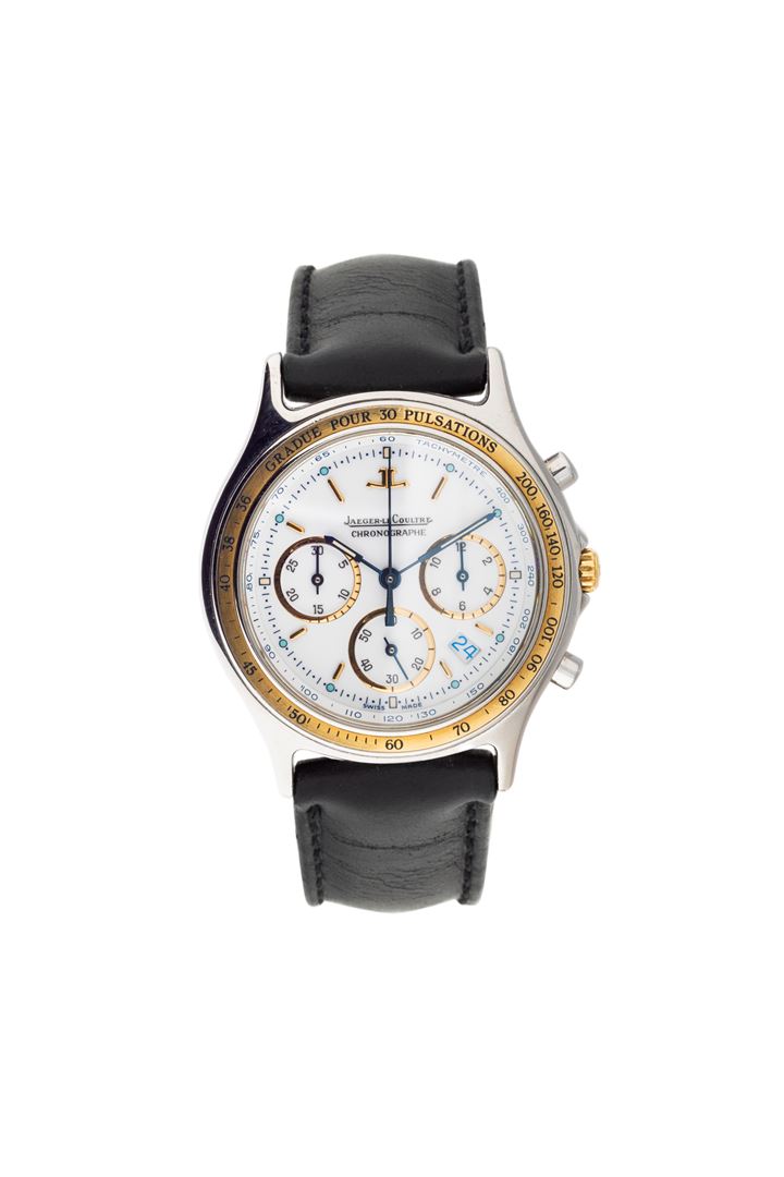 Cassa in tre corpi in acciaio; lunetta laminata in oro giallo con scala pulsometrica incisa; quadrante bianco con indici geometrici applicati; contatore ore al 3; minuti al 6; piccoli secondi al 9; secondi al centro; indicazione data al 5