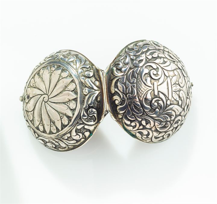 Cassa di protezione per orologio per il mercato turco, sbalzata ed inisa su entrambi i lati a motivi floreali